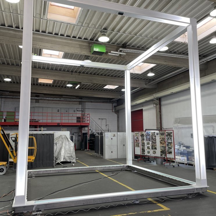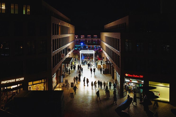 5 x 5 x 5 Meter misst der Würfel, der seit 2022 die Fußgängerzone in der Monheimer Innenstadt zu einem besonderen Ort macht. Als Skulptur, geometrische Form, Tor und Bühne konzipierte der Künstler Mischa Kuball den monheim_cube. Vor allem aber dient er als Schnittstelle zwischen Architektur und Mensch. Denn der Würfel reagiert auf die Passant:innen – mit Licht und Sound.